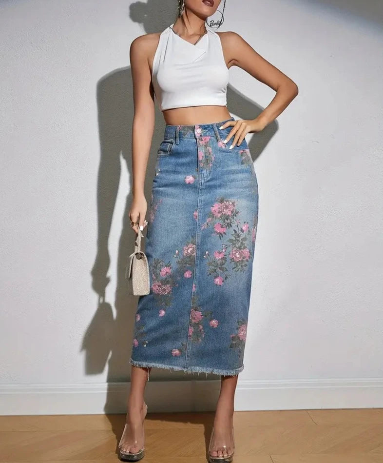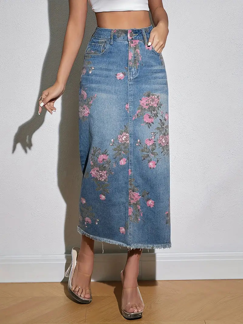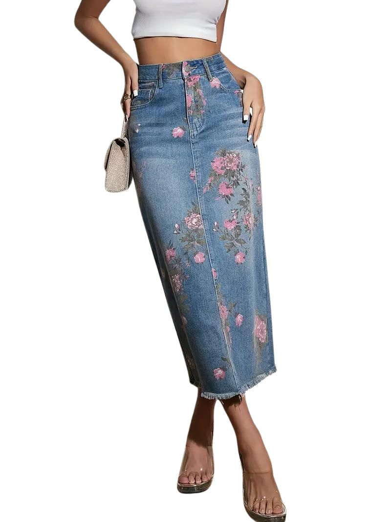 Unleash your playful side with Aileen, the floral print maxi denim skirt with a raw hem and back slit for added flair. Perfect for a fun and stylish look, this skirt is sure to make a statement wherever you go.