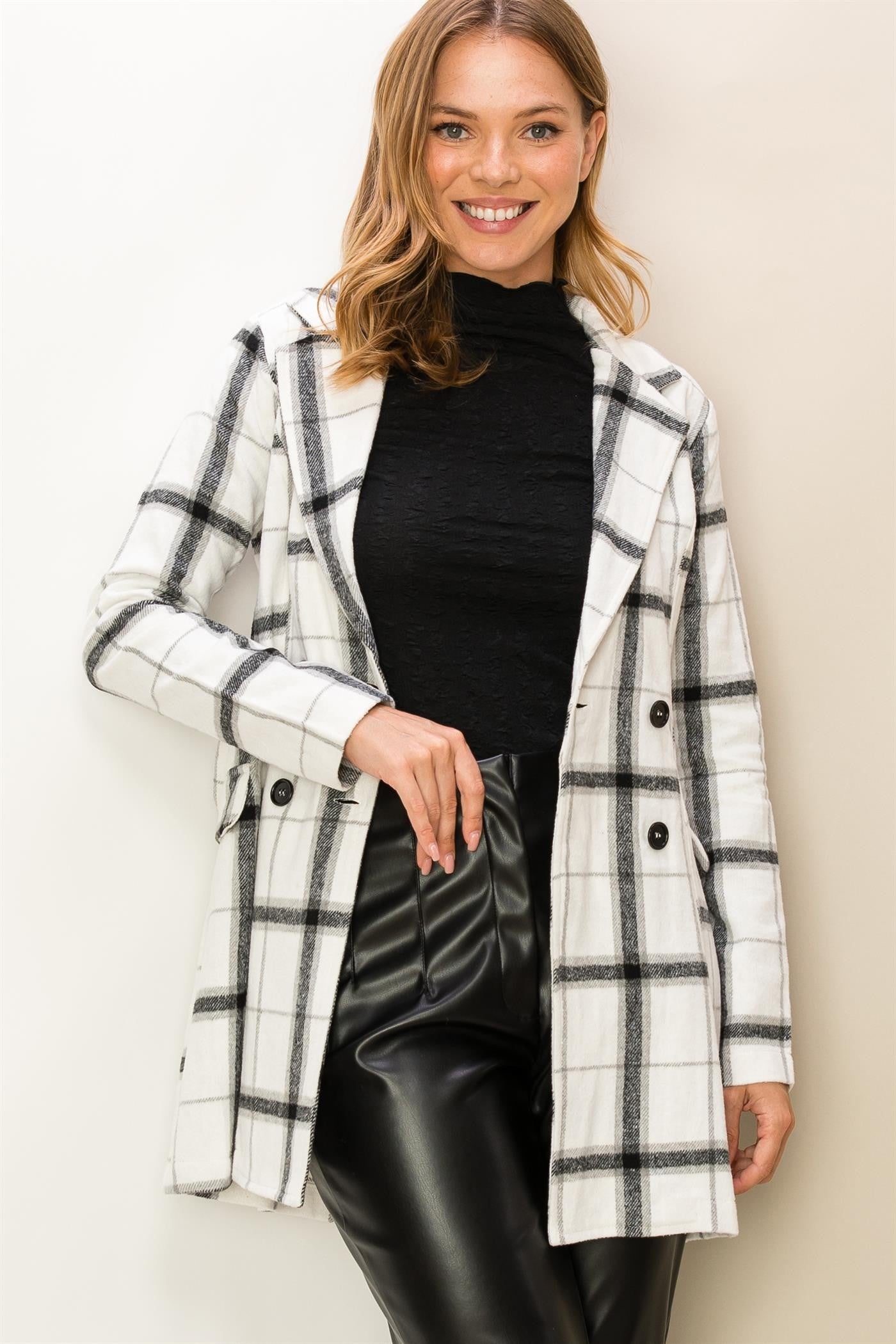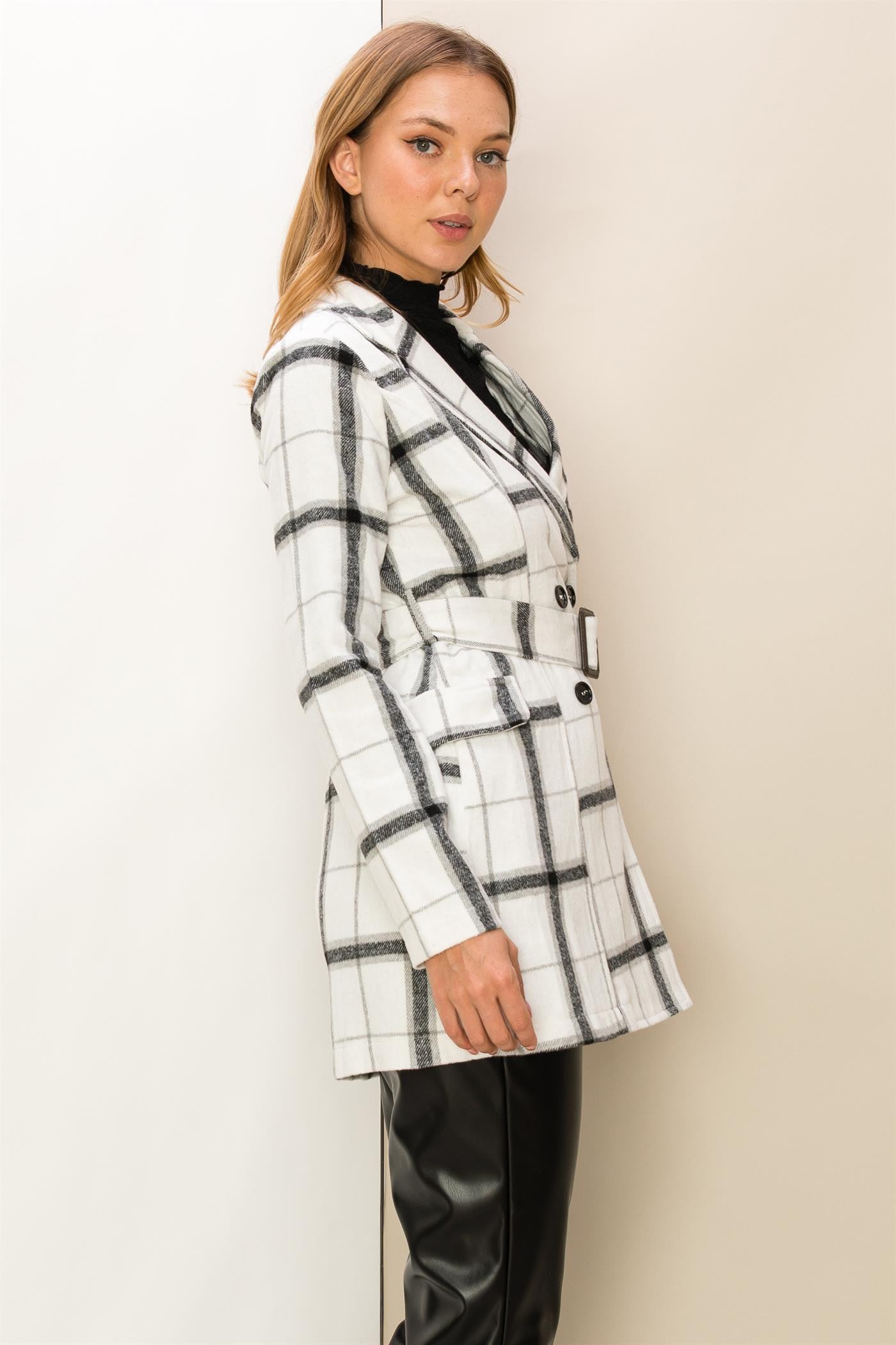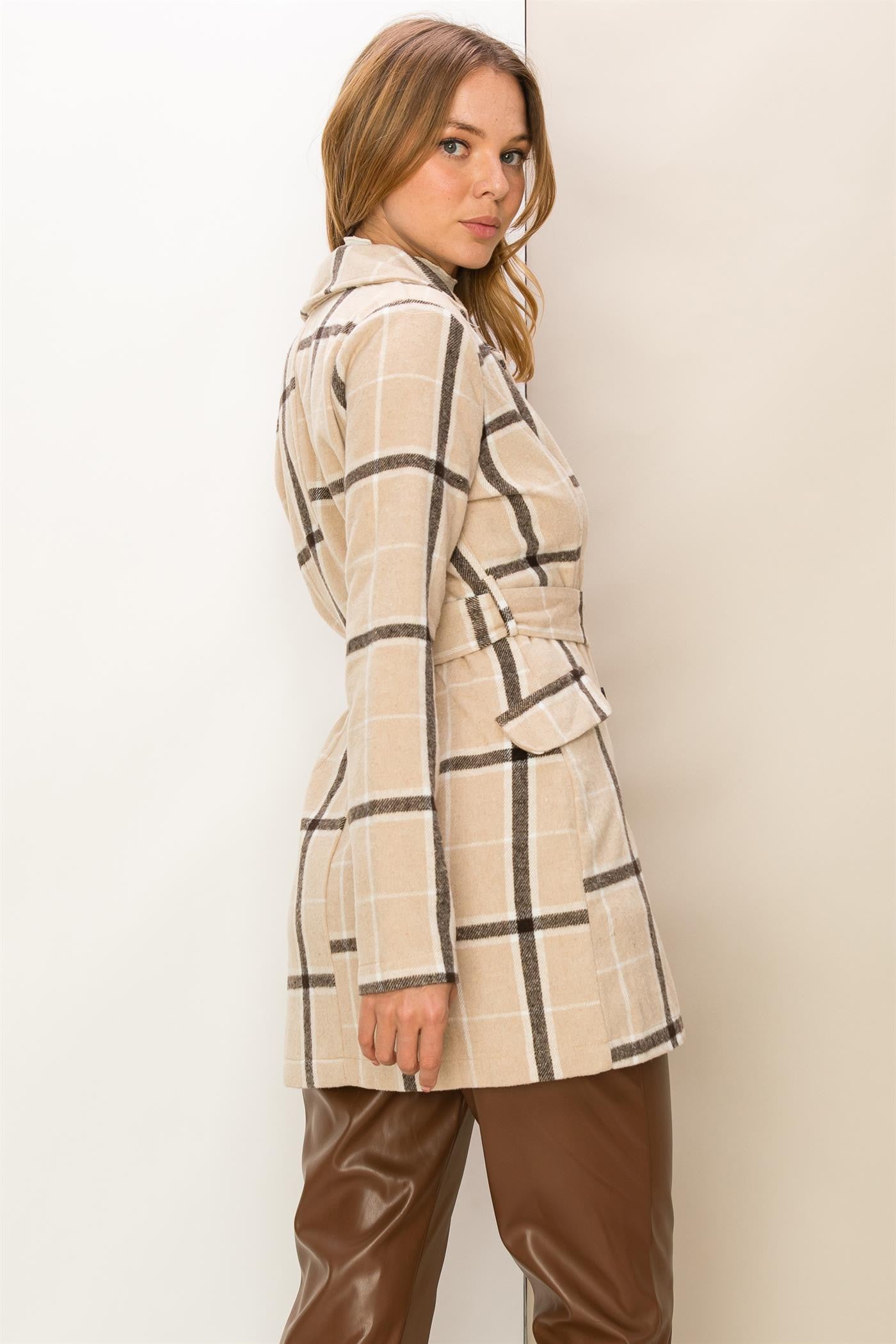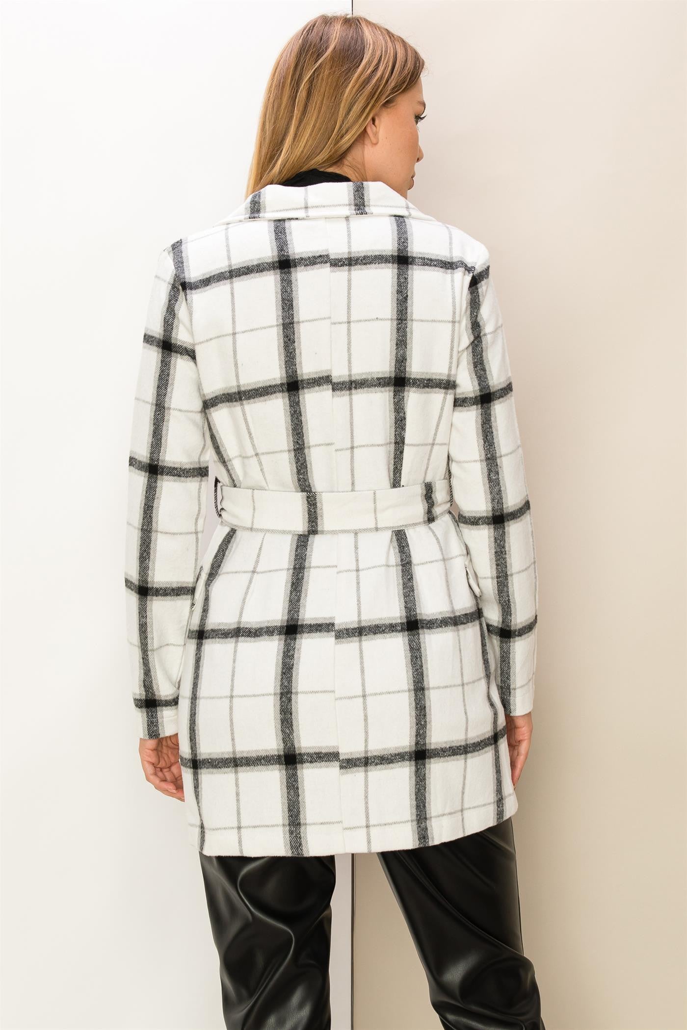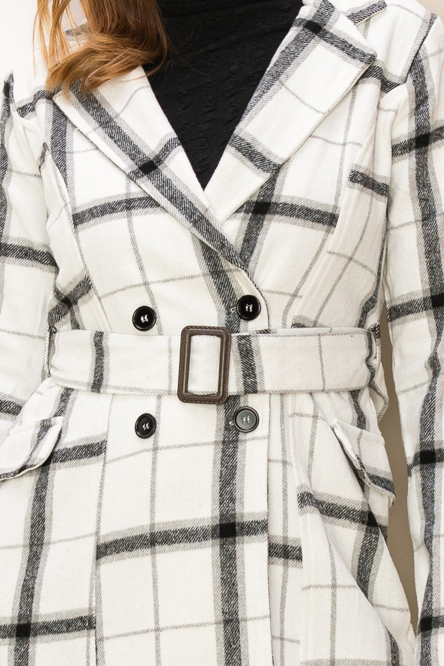 You'll be looking casually elegant in this coat! This lightweight coat/shacoat is adorned with a classic plaid print, framed with notched lapels and long sleeves. Buckle belted waist allows you to adjust the fit, finished with double breasted buttons and a flap pocket at front. Runs small.