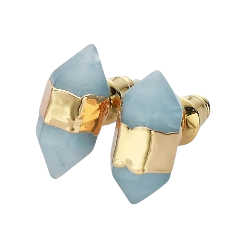 Introducing Cana, our elegant hexagon stud earrings with a playful 14K golden plated design. Made with aquamarine and a 925 silver ear needle, this pair also features a unique copper wrapped natural stone. Truly a one-of-a-kind addition to any jewelry collection.