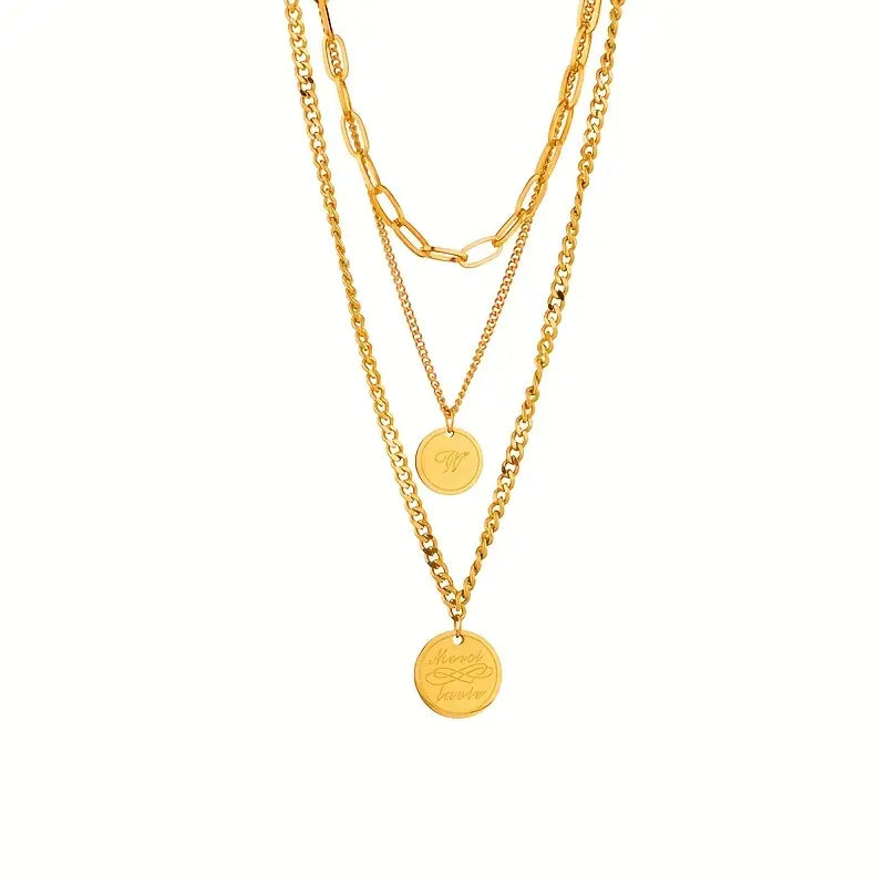 Add a touch of luxury to your style with Cersie, a unique necklace featuring a 3-layer pendant, plated in 18k gold on durable stainless steel. Elevate your look and show off your bold side with this statement piece.
