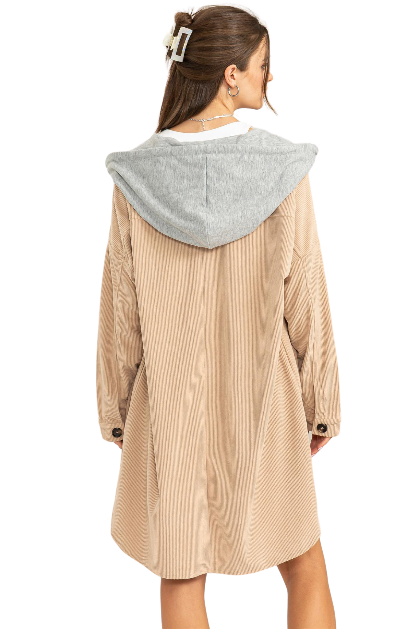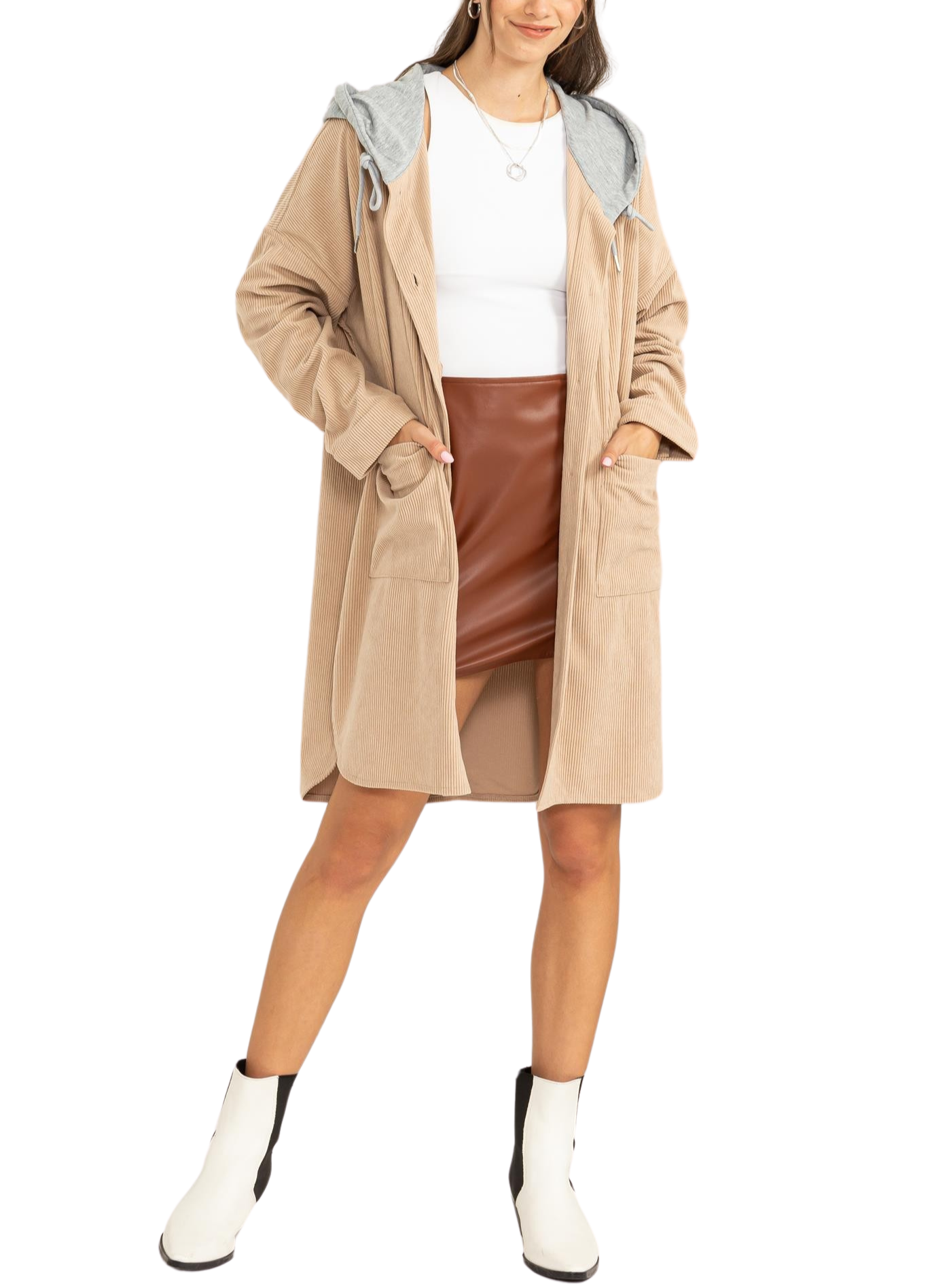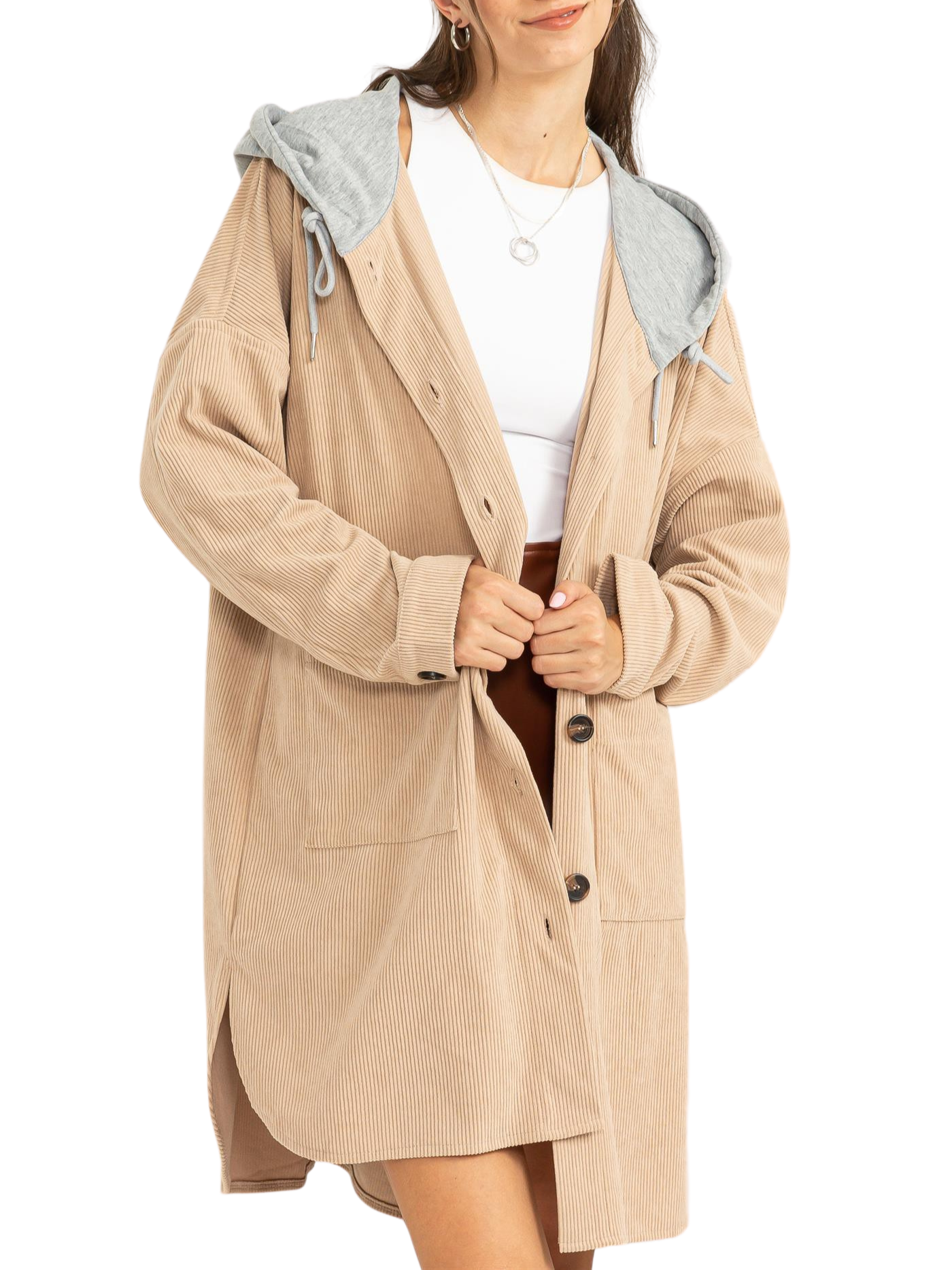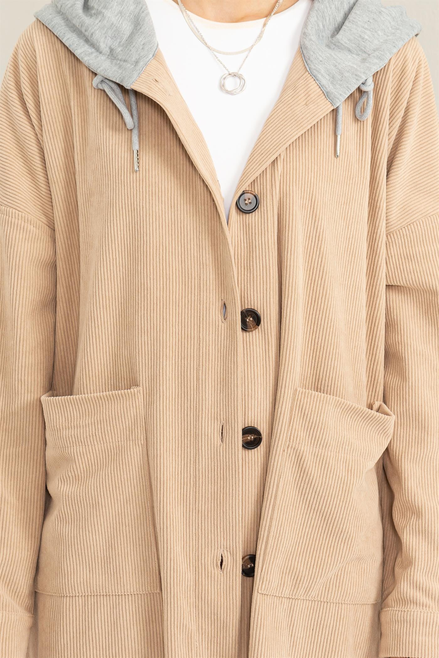 Stay warm and cozy no matter where your day takes you in this corduroy jacket that has long sleeves, exaggerated front patch pockets, and a longline button-front silhouette with side slits. The contrast drawstring hood is a bonus. Runs big.