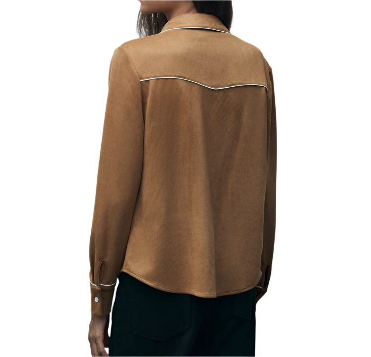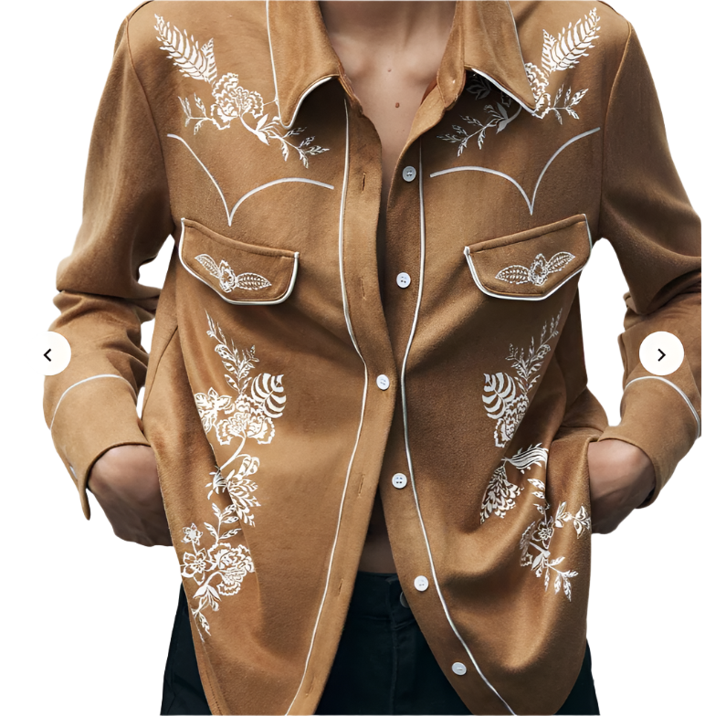 Introducing Efe, the brown bohemian faux suede shirt with a twist of elegant faux embroidery floral design. Stay cozy and stylish with its long sleeves and button-up front. A must-have for the quirky and fashion-forward!