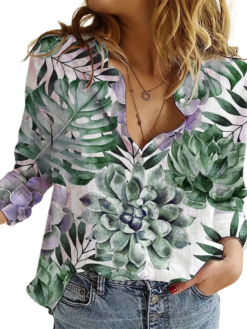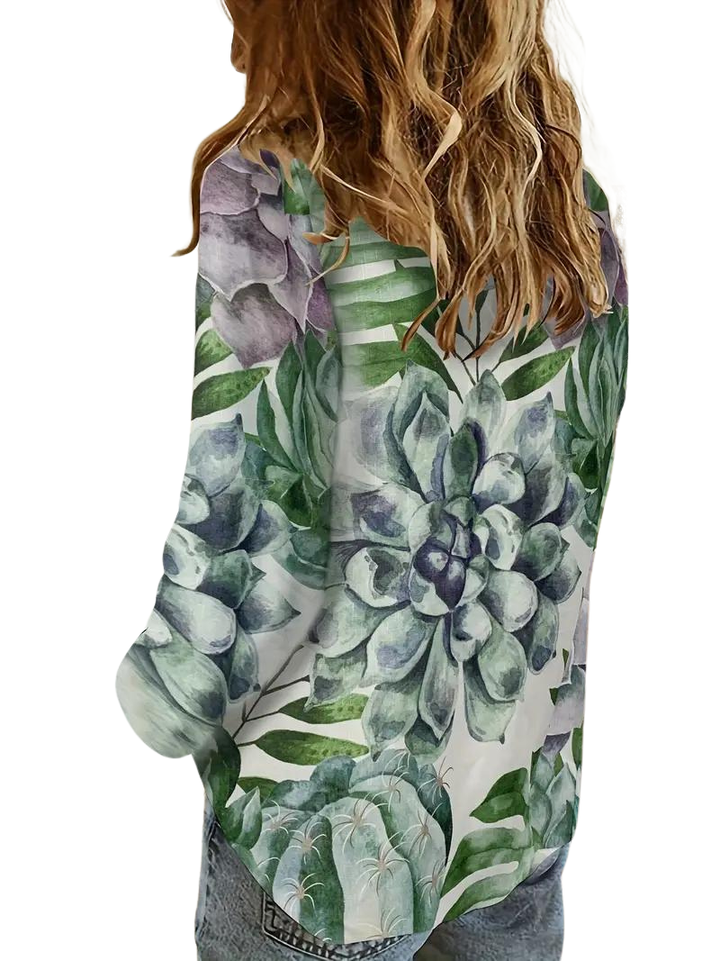 Indulge in the playful and quirky style of our Emelia shirt, featuring a succulent print and flat collar. Perfect for adding a touch of uniqueness to your wardrobe, with a playful twist. (Double meaning: Because succulents are unique and quirky, and so is our shirt!)