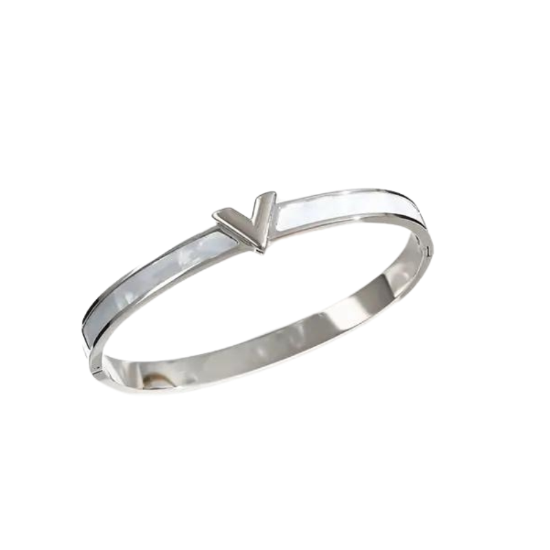 Prepare to elevate your look with a touch of whimsy thanks to Halia. This Stainless Steel Cuff showcases a sleek V design, 18K White Golden Plating, and a Shell Inlay for a playful twist. Embrace the unexpected and stand out from the rest with this quirky yet stylish accessory.