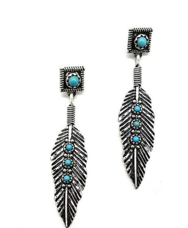 Swing into style with our Western Feather Dangling earrings! These playful accessories add a touch of wild west charm to any outfit. Lightweight and eye-catching, the delicate feather design with turquoise faux design creates movement with every turn of your head. Perfect for adding a bit of boho flair to your everyday look or dressing up for a special occasion!